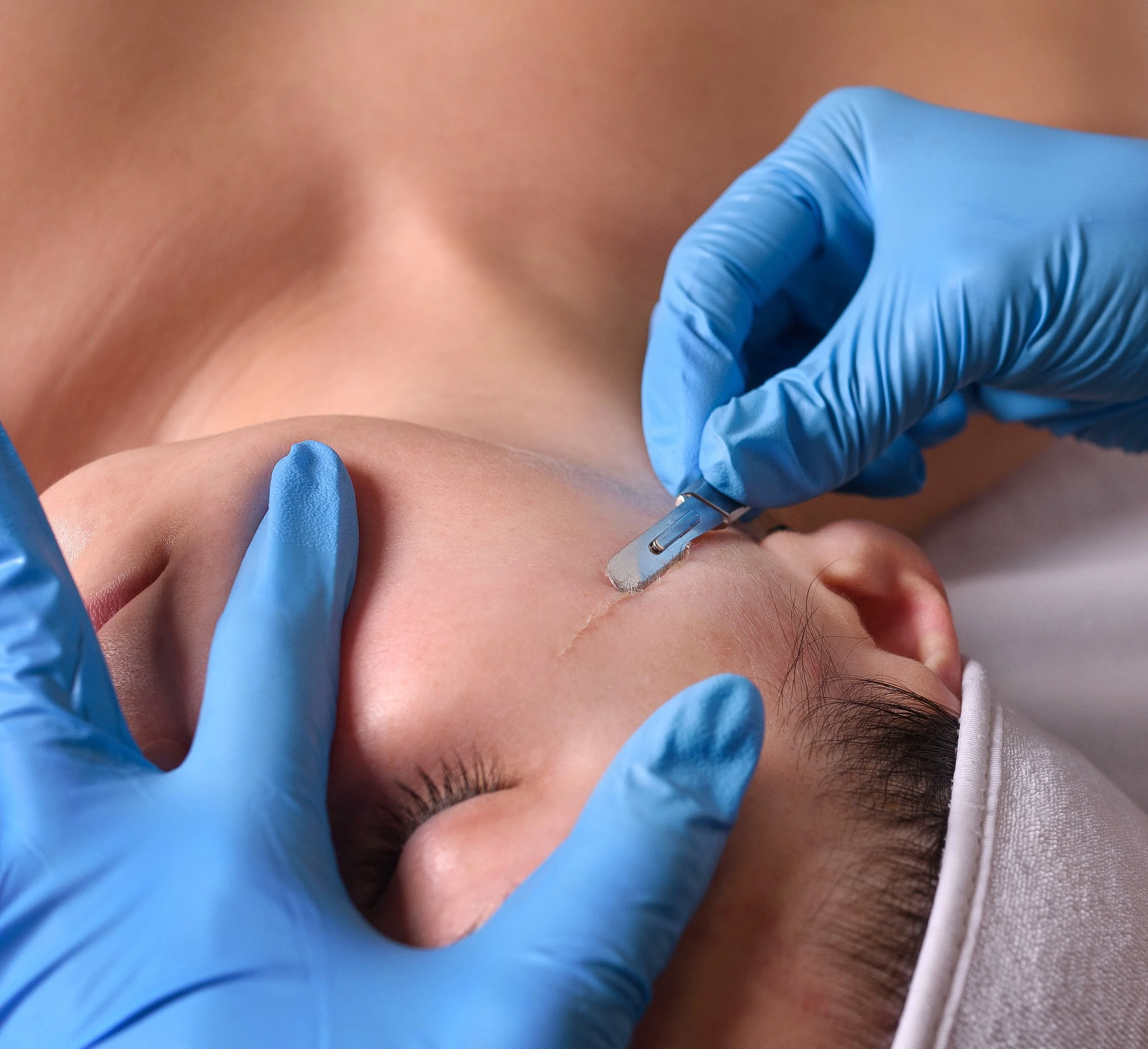 Dermaplaning is a physical exfoliation procedure. It gently exfoliates the skin's surface, removing the top layer of dead skin along with fine, vellus hair (aka peach fuzz). These vellus hairs collect dirt and oils and removing them helps to reduce breakouts and the exfoliation refines your fine lines. Your face will have an instantly smooth surface along with a youthful, radiant look and feel.
